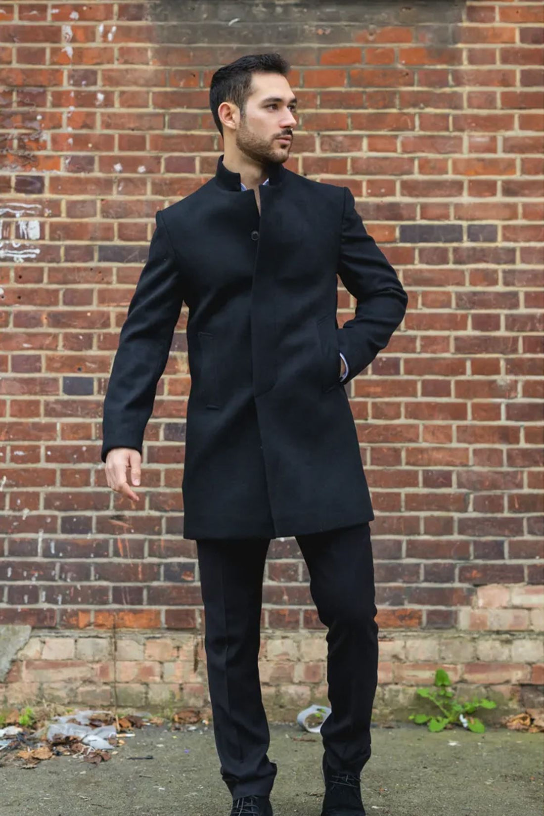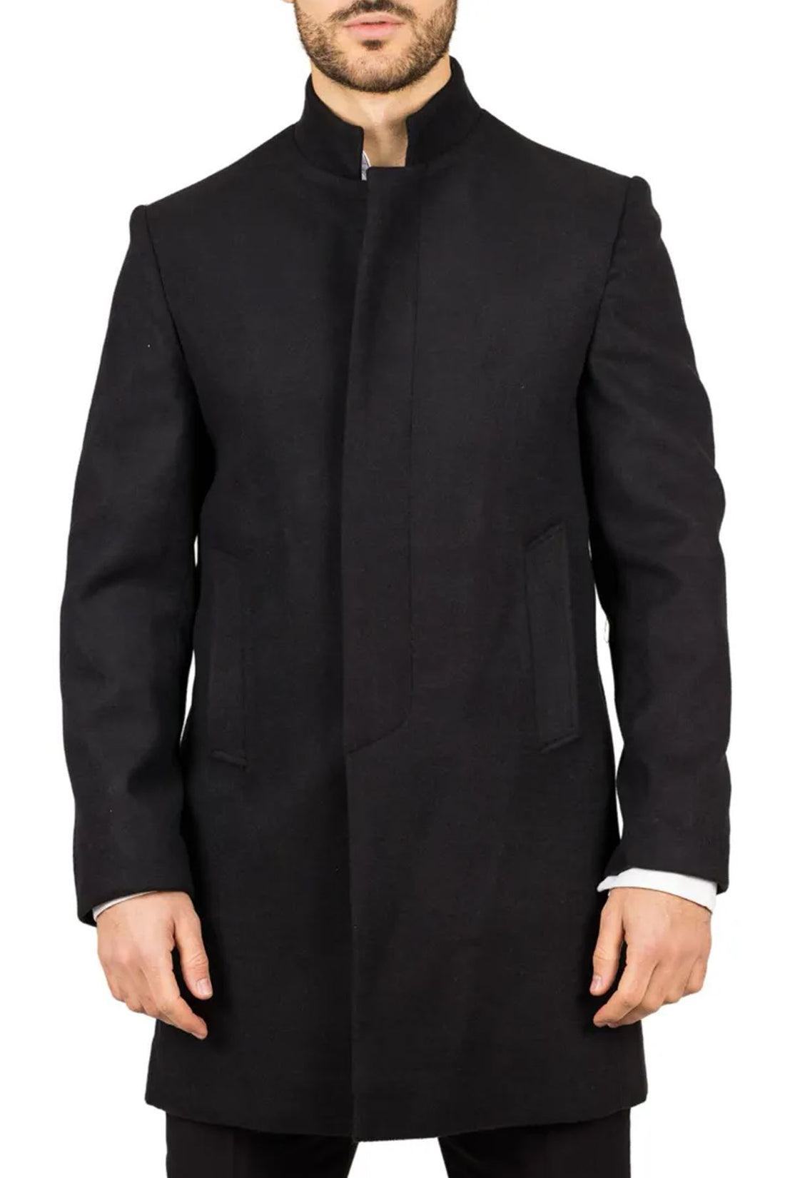 Men's Black Stand Collar Wool Blend Overcoat- Regular price