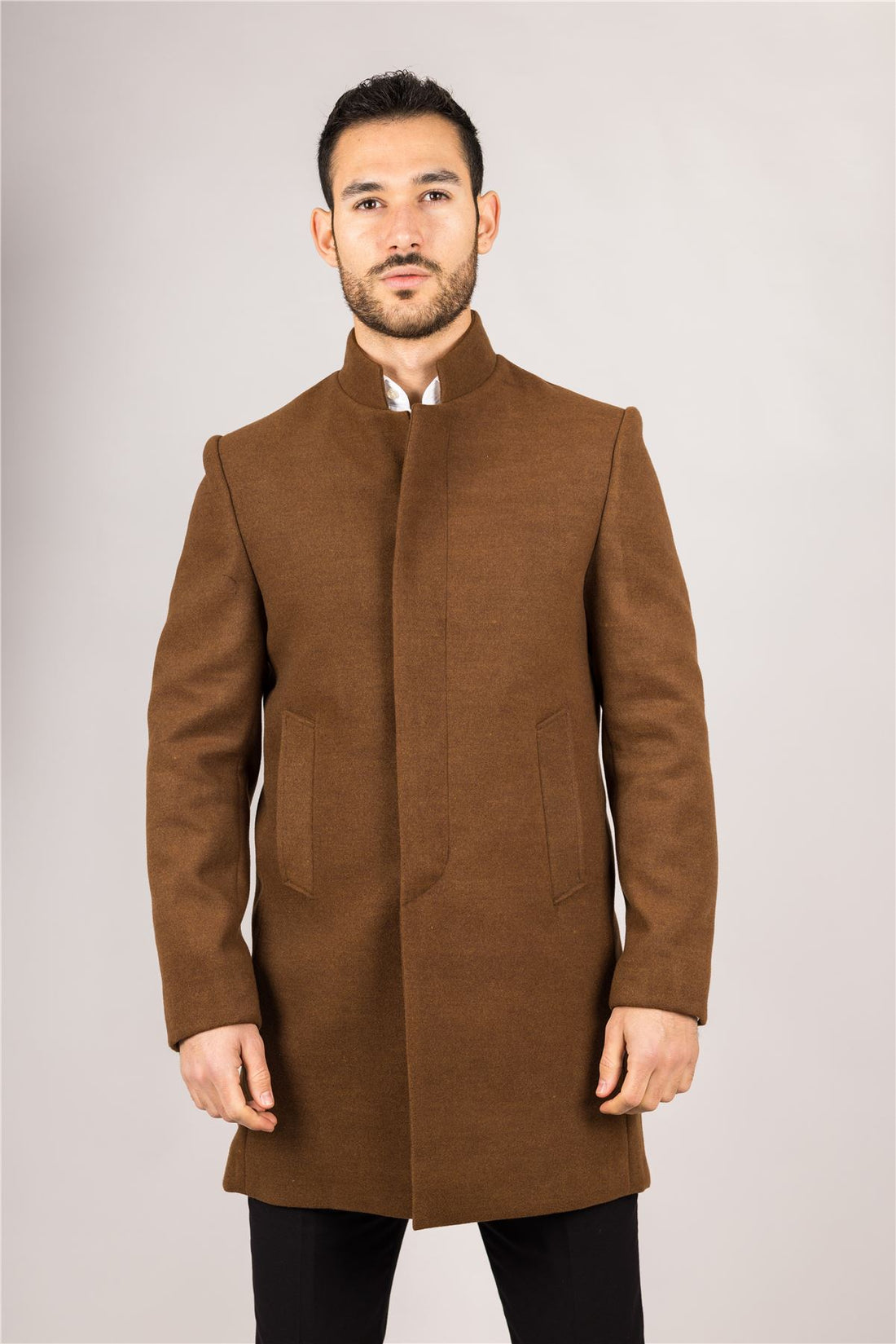 Men's Tan Stand Collar Wool Blend Overcoat- Regular price