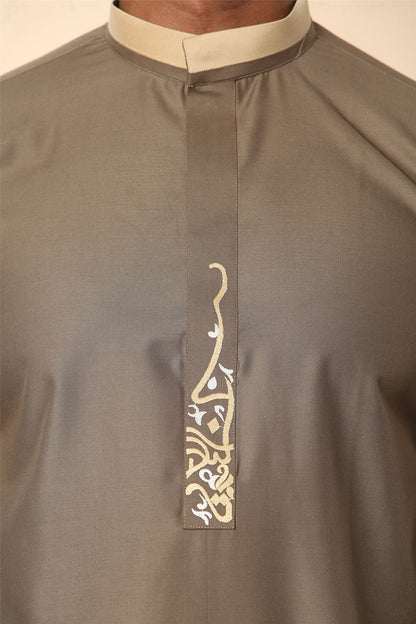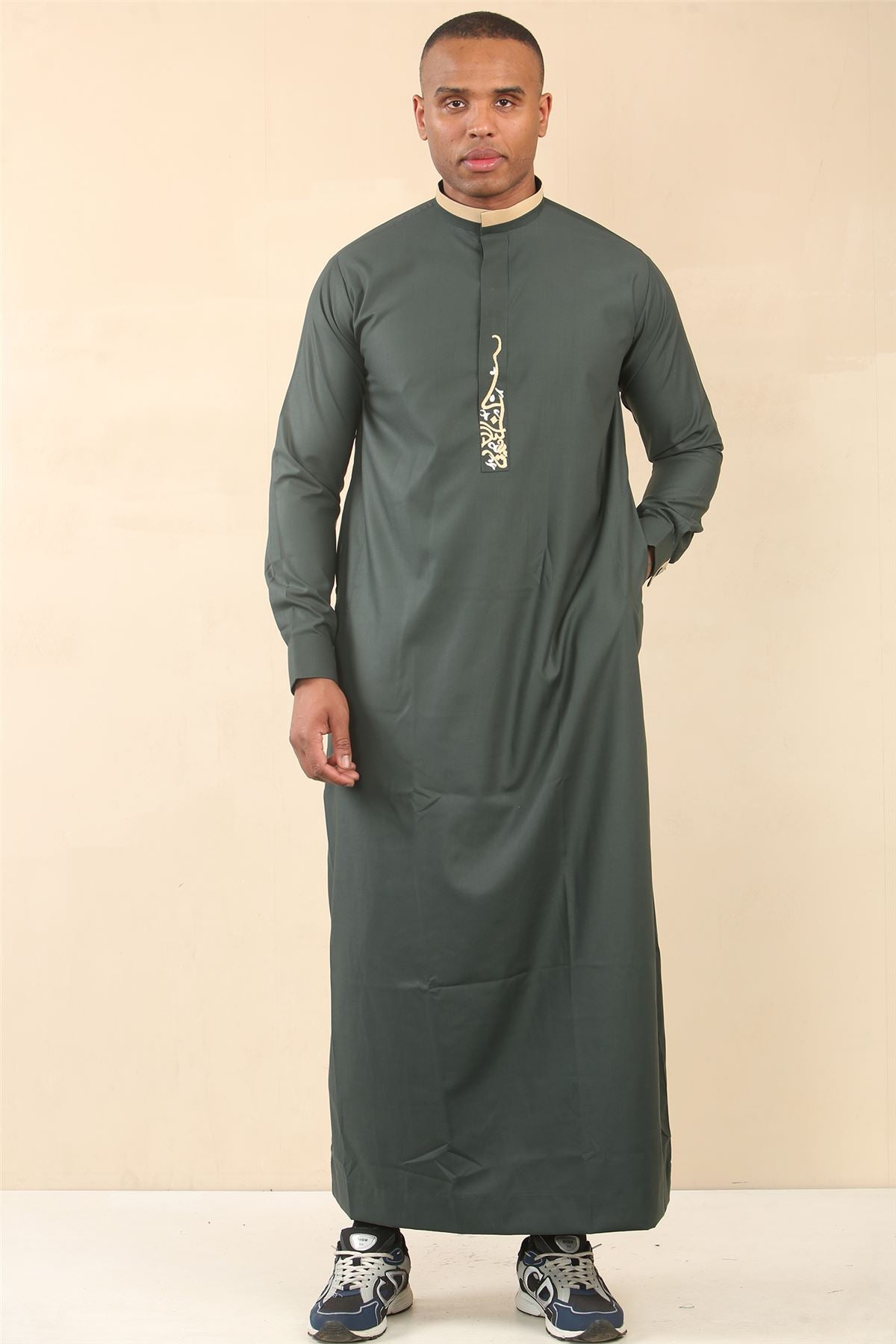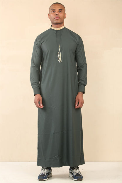 Elevate your wardrobe with this exquisitely designed men's thobe, crafted for both elegance and comfort. Made from premium-quality fabric with intricate gold embroidery, this thobe seamlessly blends traditional Islamic aesthetics with modern sophistication, making it a perfect choice for various occasions.