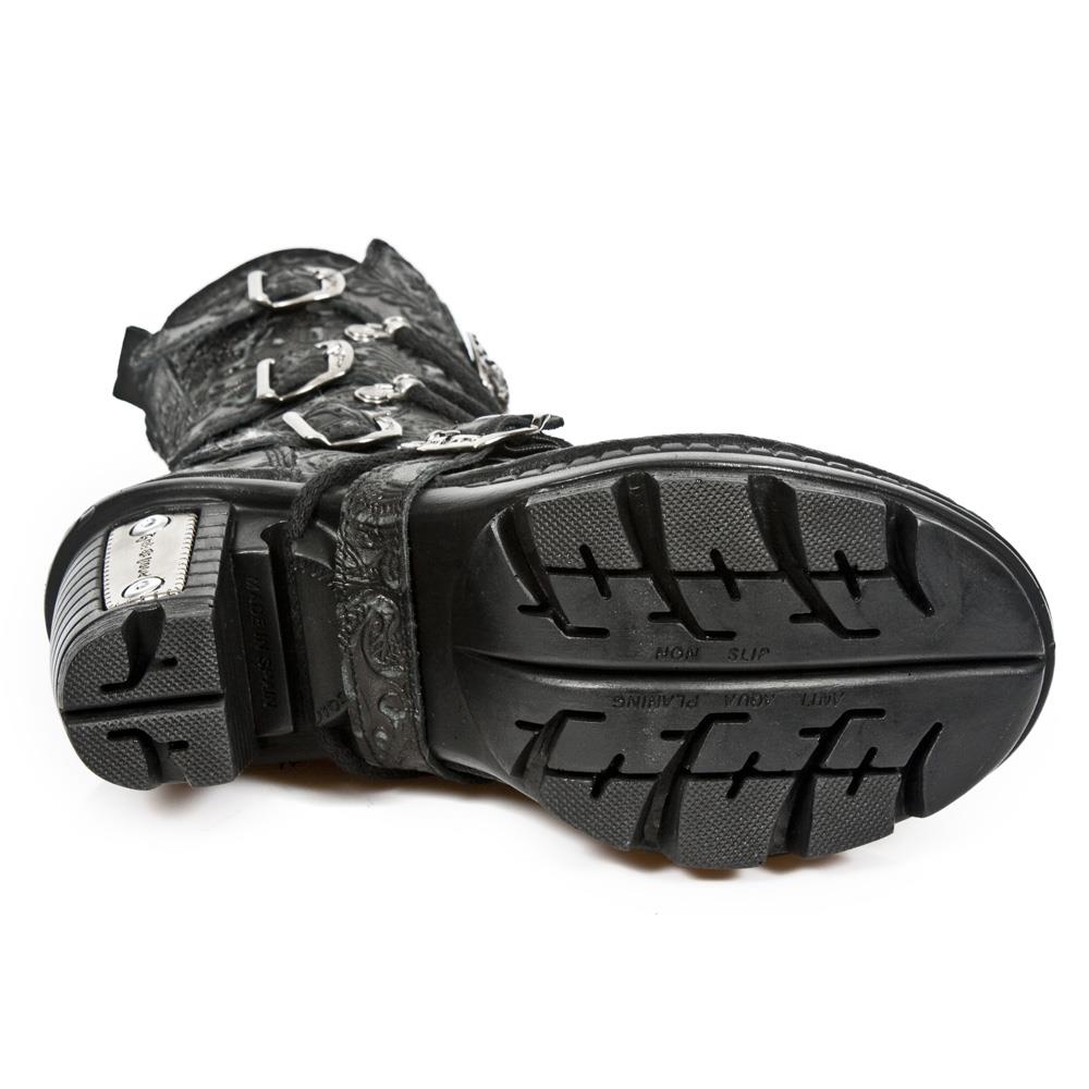 • Modern Metallic Accents: The boot incorporates a distinct metal motif with metal buckles at the fastening, a high metal heel, and metallic New Rock branding, adding a modern edge to its overall aesthetic.